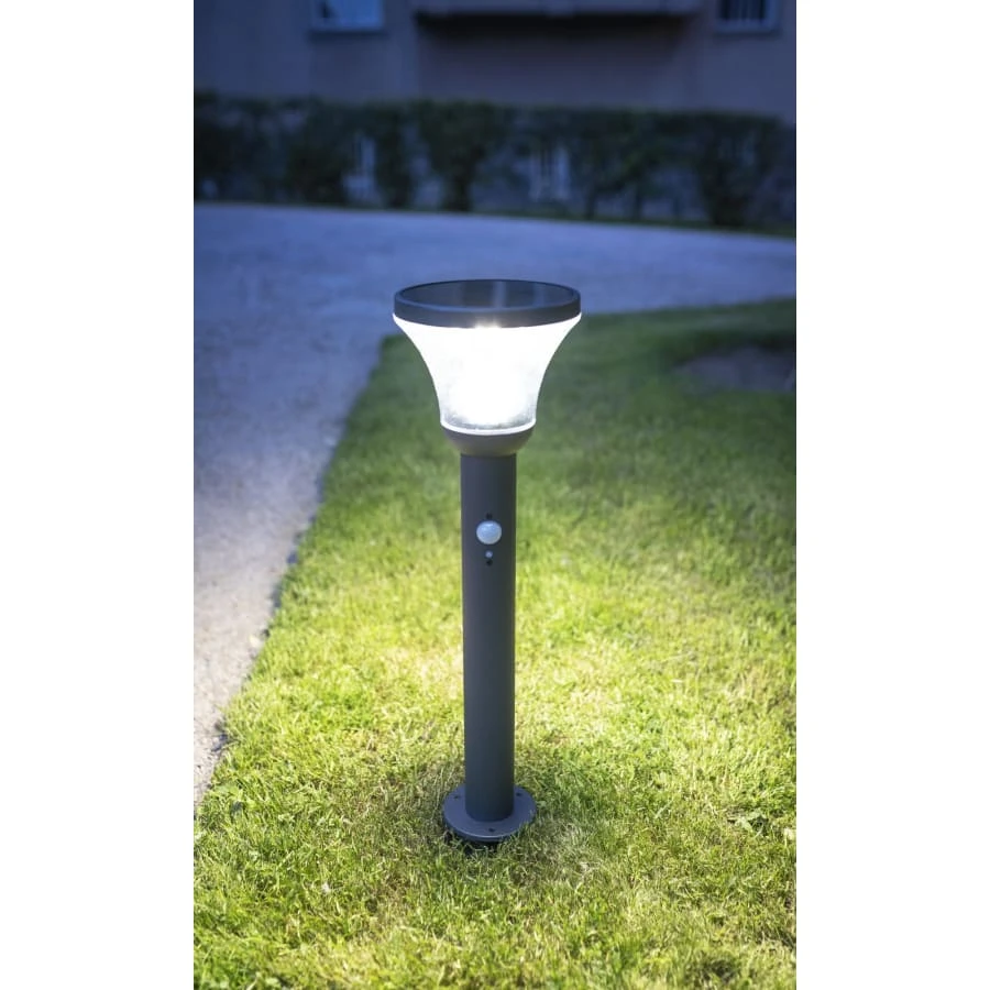 An attractive solar lamp with dimmer switch and motion detector. Wide lighting angle. Three action options.