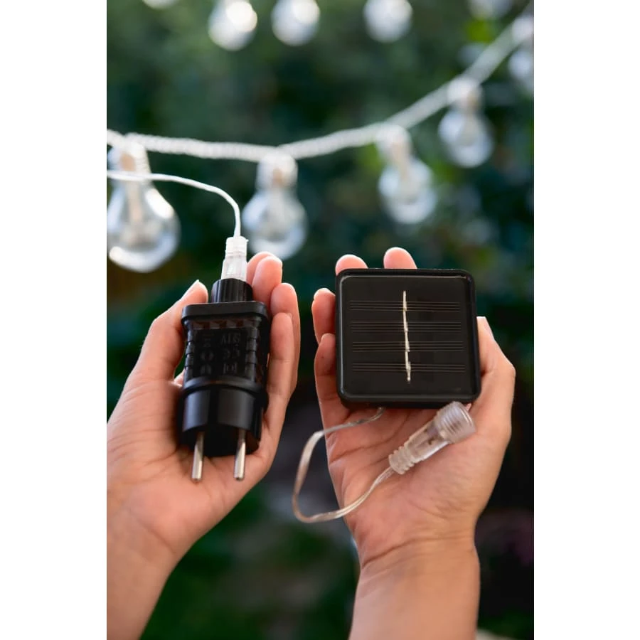 En uppsättning lampor som fungerar med både en solcell och en transformator. När hösten kommer och solljuset minskar, och batteriladdningen inte räcker till för att hålla lysdioderna tända länge, byt strömkälla från en solcell till en transformator. Både cellen och transformatorn ingår i paketet.
