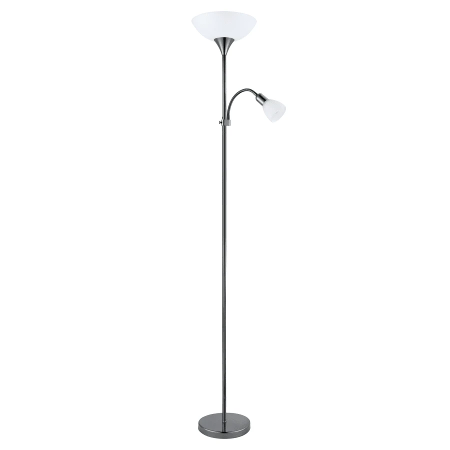 The UP 2 floor lamp has a black nickel finish. The white glass head casts light onto the ceiling, creating pleasant indirect lighting. The white glass spotlight on the body of the floor lamp is flexible, so it is perfect for use as a reading light. The two light sources switch on and off individually and easily using the two switches on the cable. The classic uplighter blends with various interiors and provides modern lighting for any space, whether in the bedroom or living room. Lightbulbs are not included. The floor lamp has an E27 lamp holder and an E14 lamp holder and requires an E27 lightbulb and an E14 lightbulb.