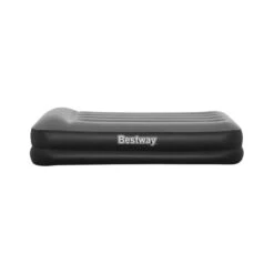 Straight-line TV stand. Black metal legs, oak-colored coated MDF shelves.