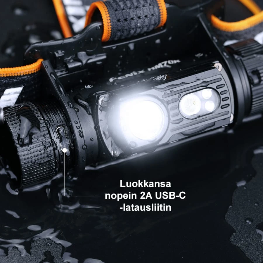 - Toimitussisältö: HM70R otsalamppu, pää- ja otsapanta, Fenix ARB-L21-5000 mAh ladattava akku, USB C-latausjohto, otsapannan solki , vaihdettava O-rengastiiviste, käyttöohje.