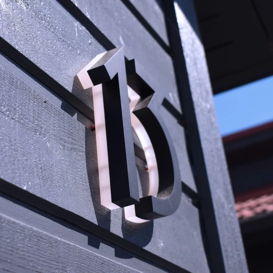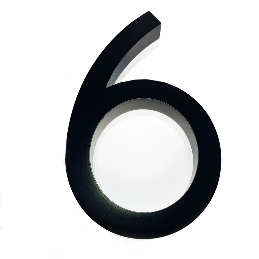 Svart husnummer/bokstav med led-bakgrundsbelysning. Högkvalitativa material och en stark bakgrundsbelysning garanterar synlighet och lång livslängd. Den svarta metallramen är gjord av rostfritt stål (kvalitet 304). led-bakgrundsbelysningen är vattentät.