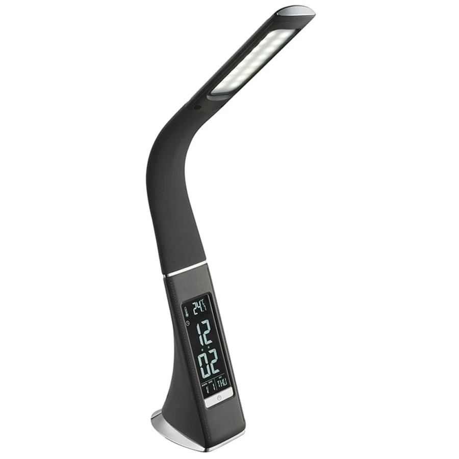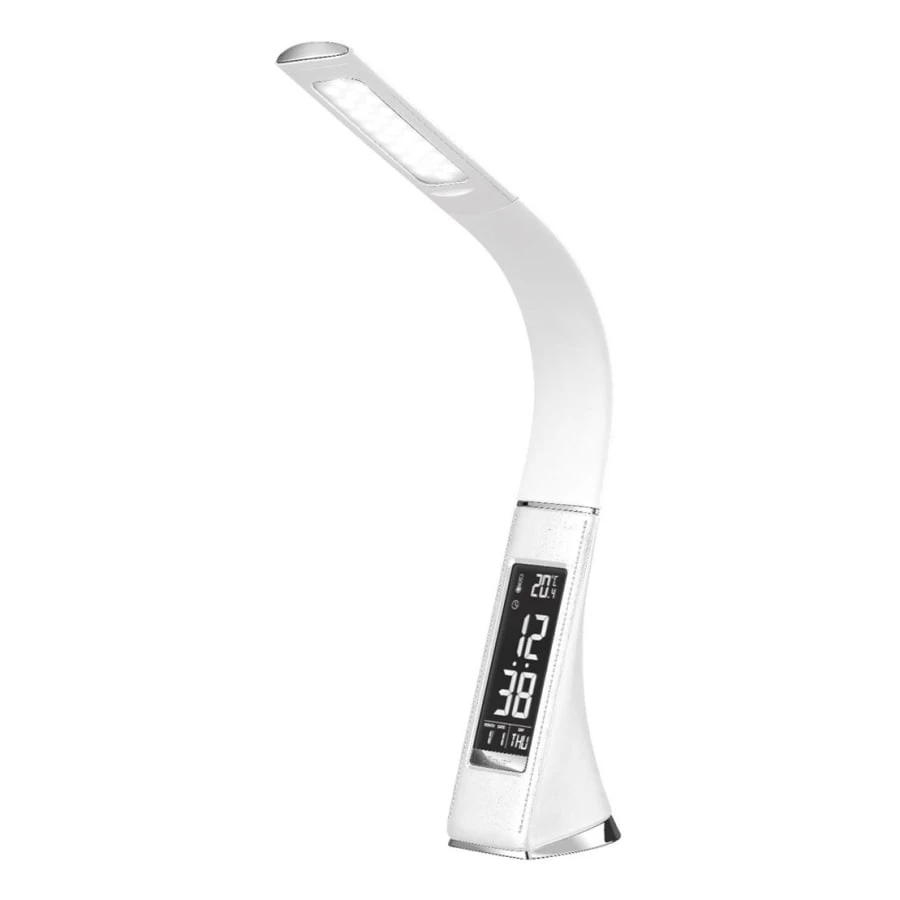 Toppdesign, praktisk och snygg LED-bordslampa med kraftfull 5W integrerad LED, touchdimmer, färgtemperaturjustering (3000K/4000K/5000K), kalender, klocka och väckarklocka. Med dimmern med 3 olika effektinställningar kan du justera lampans ljuseffekt. Lampan har en böjbar arm, som kan användas för att rikta ljuset efter önskemål.