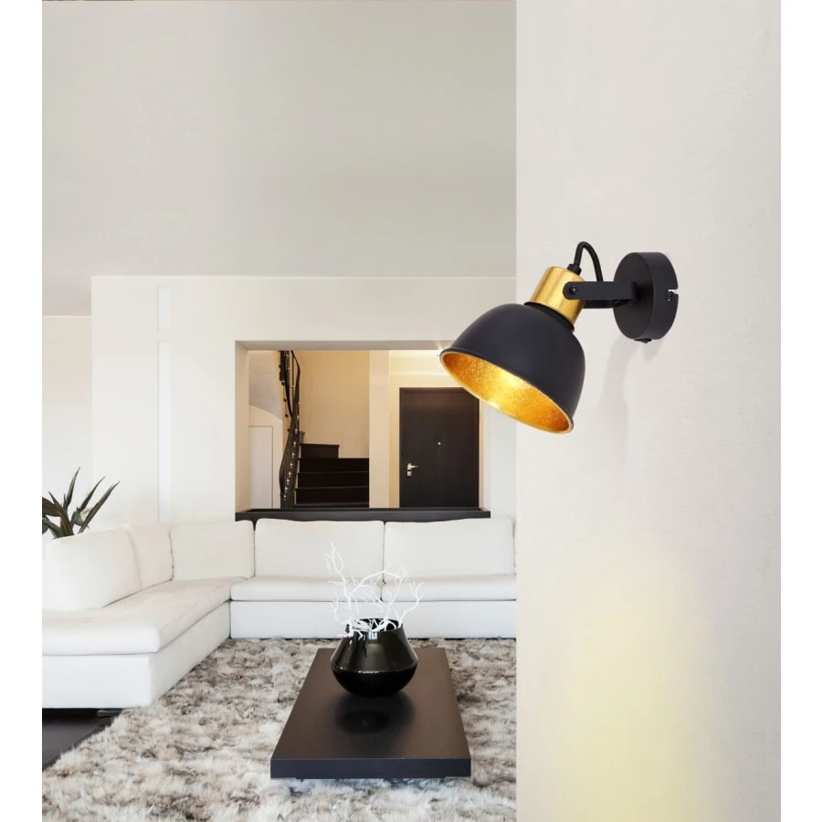 Denna spotlight från FILLO-serien imponerar med sin raffinerade design. En rund, rörlig lampskärm med bladguld yta på insidan är fäst på en rund väggplatta. Denna vägglampa kan tändas och släckas med en strömbrytare på väggplattan. Den stiliga svarta exteriören gör lampan komplett. Tack vare det fria valet av ljuskälla (E14 / max 25W) kan du själv bestämma ljusets intensitet och färgtemperaturen på ljuset. För lång livslängd rekommenderar vi LED-ljuskällor. Med andra lampor i denna serie kan du komplettera din heminredning.