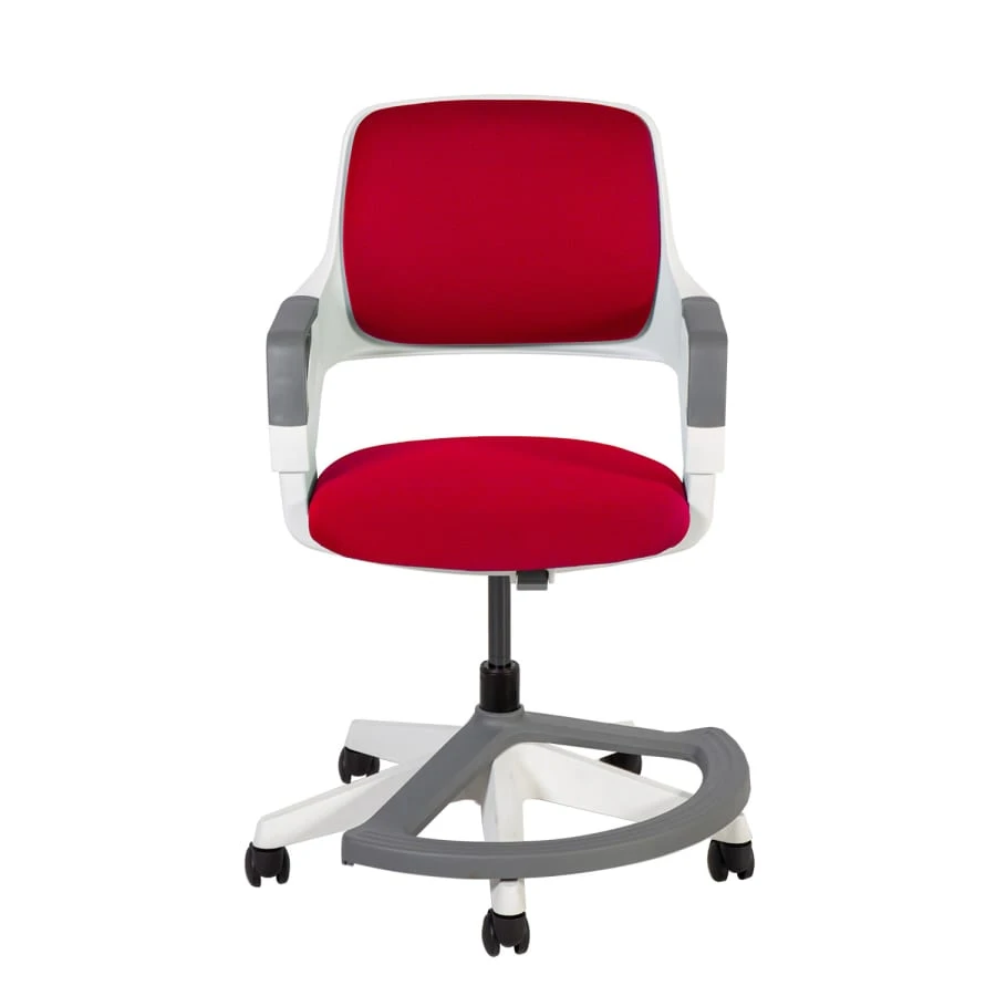 Padded seat and backrest, dark red, frame: white plastic. Children’s chair ROOKEE is an office chair that grows with the child, whose ergonomics adjust as the child grows. The children’s chair is best used by schoolchildren aged 4-14 (110-116cm tall). The backrest has 7 positions. The height of the back of the chair and the depth of the seat are adjusted according to the height of the child. The height of the armrests rises automatically when the backrest is moved backwards and upwards. The swivel footrest provides comfort for children of all ages. Ringo children’s office chairs have removable cushions, this makes them easier to clean. The frame of the chair, the armrests, the leg cross and the footrest are made of injection-molded plastic (PP 100% recyclable). The height of the seat is adjustable with a gas spring 38-50cm. Backrest height adjustable 38-43cm.