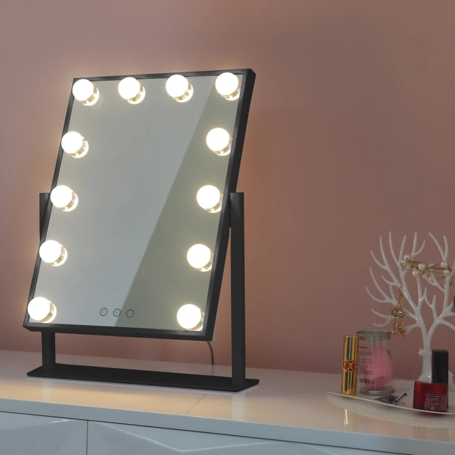 Stylish metal-framed Hollywood make-up mirror with 12 led lights. Light temperature and brightness from the touch button on the adjustable mirror. Adjustable temperature and brightness allow the right light for any situation. You can tilt the mirror to the desired angle. Coating at the bottom of the mirror better in place.